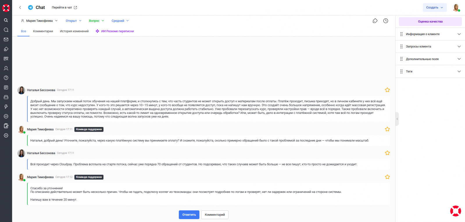 Второй пример — образовательная платформа. Диалог длинный и насыщенный: проблема с доступом после оплаты через Cloudpay, письма приходят, но курс остаётся закрытым; у одних доступ появляется через 10–15 минут, у других — только вручную; минимум 70 похожих обращений. Клиент добавляет новые детали по ходу разговора, оператор уточняет масштаб и передаёт задачу техкоманде.