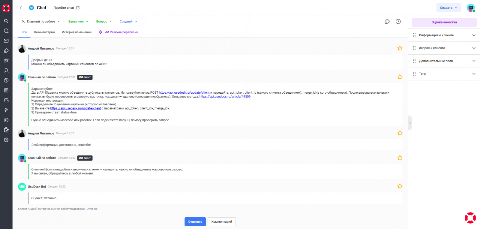 Мы в Юздеске подходим к качеству иначе. ИИ-агенту команда поддержки действительно может доверить значимую часть работы. Он не выдаёт лишнего, не «додумывает», отвечает мгновенно и держит уровень опытного оператора. По сути, это идеальный сотрудник, который способен заменить половину команды, не теряя в качестве. Именно это и ищет бизнес: не растить издержки, а получать быстрый, аккуратный сервис, который устраивает и компанию, и клиентов.