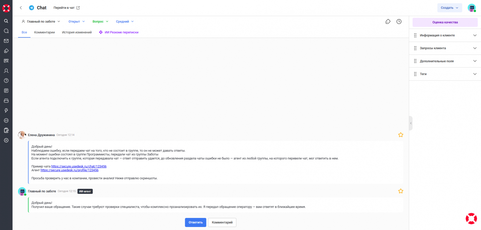 А вот другая ситуация: клиент описывает некорректную работу при передаче чата: вложения, скриншоты, конкретные роли и настройки групп. Такой запрос уже выходит за рамки типовых сценариев и требует ручной проверки. ИИ-агент не пытается угадывать или додумывать лишнее. Он корректно объясняет, что ситуация требует анализа специалиста, оформляет перевод на оператора и сообщает клиенту, когда ждать ответ.