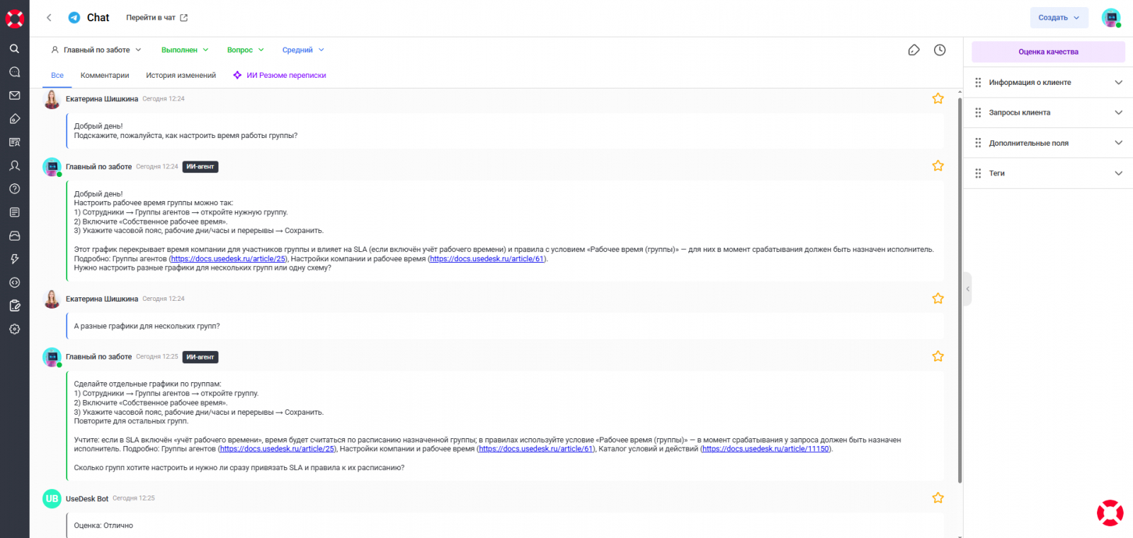 Клиент спрашивает, где настроить рабочее время групп. ИИ-агент Юздеска мгновенно понимает, что речь идёт о настройках SLA, и выдаёт чёткую инструкцию: куда зайти, что включить, как сохранить расписание и на что это влияет. Диалог закрывается за несколько секунд с оценкой «Отлично».