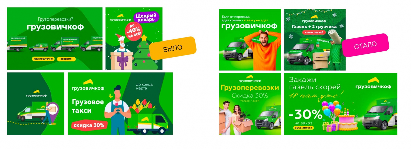 До запуска с VBI клиент использовал в коммуникациях в визуальных креативах преимущественно иллюстрации. Теперь «Грузовичкоф — это сервис с человеческим лицом. Креативы «оживили» с помощью фотографий живых людей.