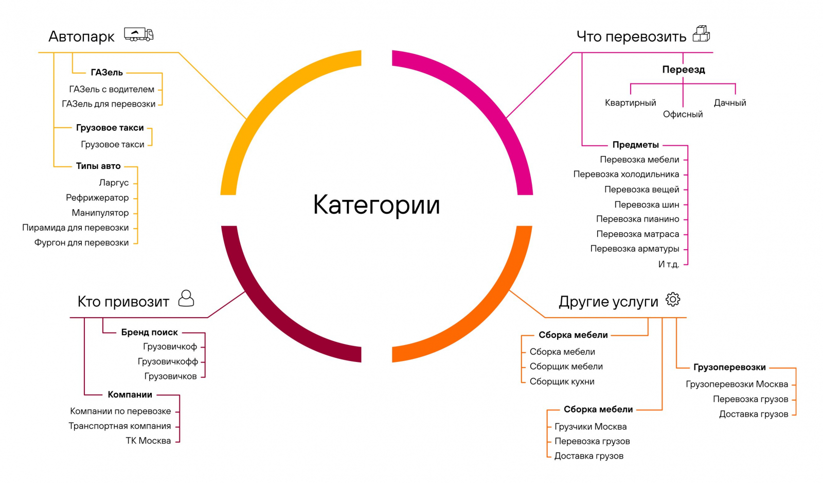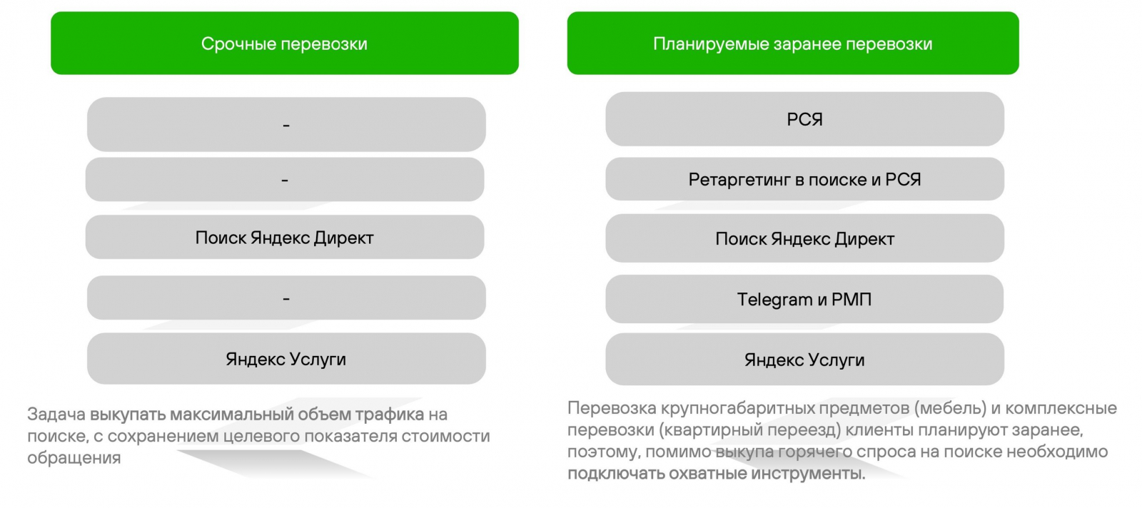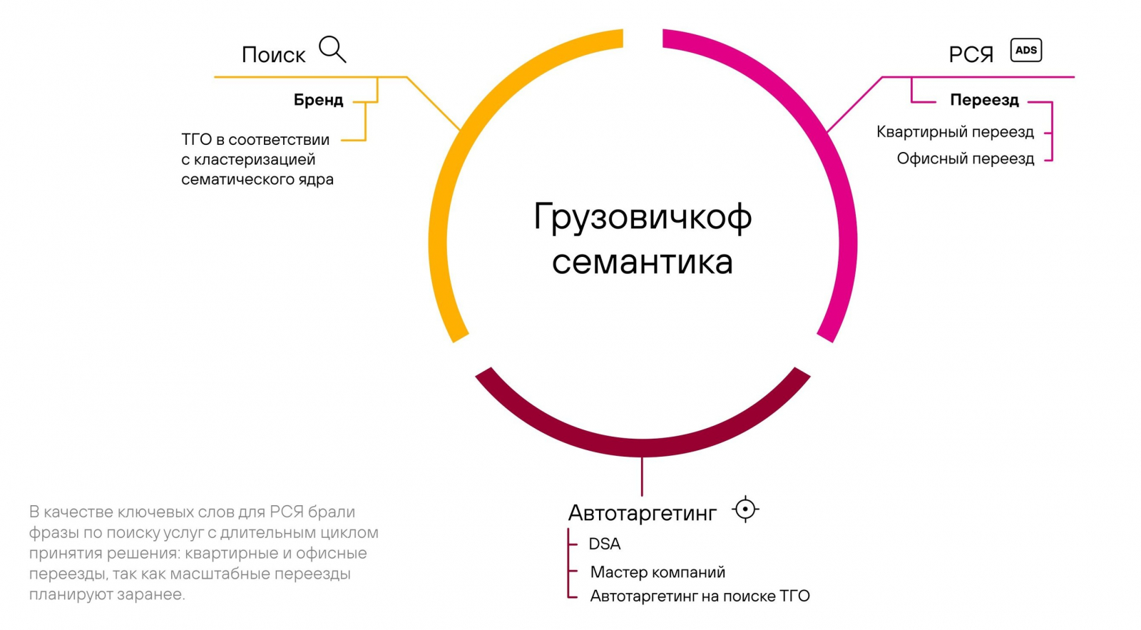 2. Вывод на ведущие позиции в московском регионе. Так как сервис Грузовичкоф появился сначала в Санкт-Петербурге (там доля обращений по бренду составляет 60–70%), а в Московском регионе сервис был менее известен, основной упор в контекстной рекламе на поиске был на небрендовые рекламные кампании.
