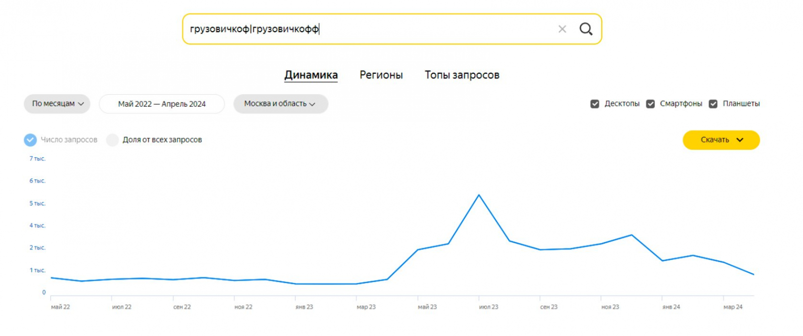 В период январь-апрель 2024 доля обращений по бренду находится в пределах 48-50%.