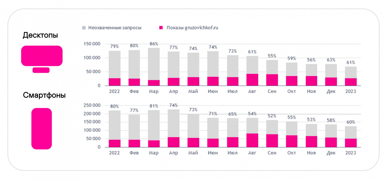 Агентство VBI и компания «Грузовичкоф» начали сотрудничество в июне 2022. С июля 2022 доля неохваченных запросов снижается. В performancе важно масштабирование при достижение целевых KPI заказчика. Что нам и удалось сделать при охватной, достаточно агрессивной стратегии.