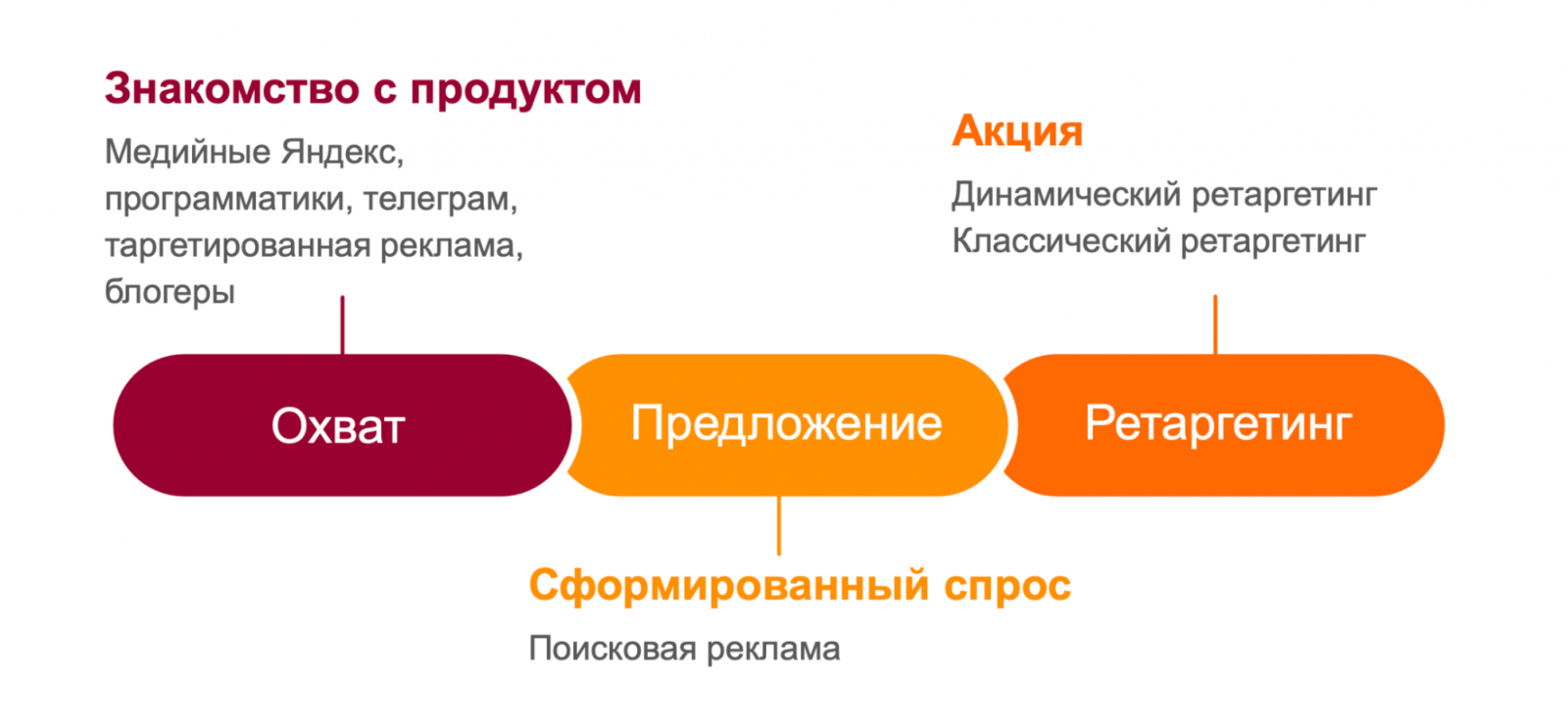Учитывая амбициозные цели, заказчик изъявил готовность активно тестировать гипотезы и инвестировать в освоение новых каналов, поддерживая наши предложения. Это ключевое отличие от проектов, в которых заказчики требуют максимальную отдачу от каждого вложенного рубля, боясь проводить эксперименты и тем самым ограничивая используемые инструменты (в моменте это может давать высокие показатели ROMI и ДРР, однако негативно влияет на стратегическое развитие в будущем).