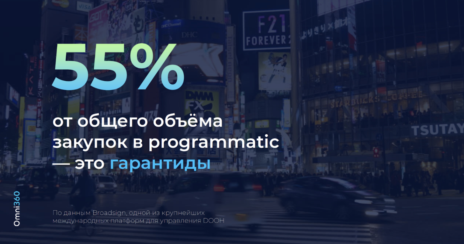 Programmatic Guaranteed (Flex) решает эту проблему, сохраняя автоматизацию, но фиксируя ключевые параметры сделки — стоимость, объем и выбранные экраны. По данным ведущей международной платформы Broadsign, 55% всех programmatic-закупок DOOH сегодня приходится именно на гарантиды, что отражает запрос рынка на стабильность и контроль кампаний.