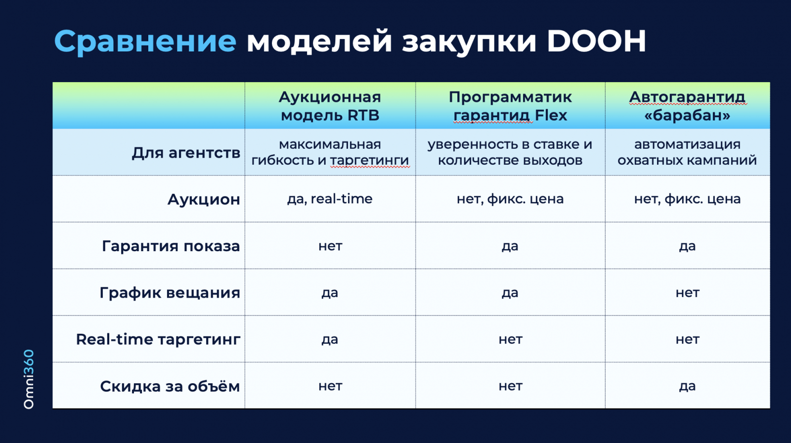 Аукционная programmatic-закупка (RTB) даёт максимальную гибкость и доступ к real-time-таргетингам — по времени, погоде, трафику, аудитории и другим параметрам. Однако при высоком спросе или дефиците слотов она не гарантирует фактический показ.