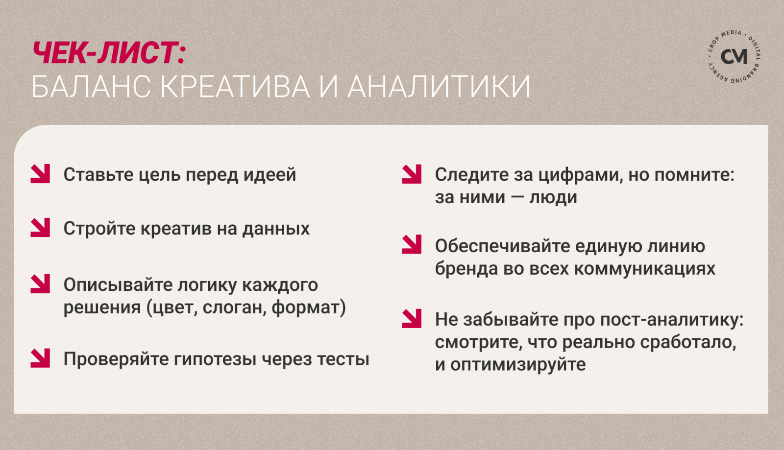 В CROP media мы называем это управляемым креативом: идеи, которые рождаются из данных и встроены в стратегию. В этой статье разберём, зачем нужен баланс и как его построить.