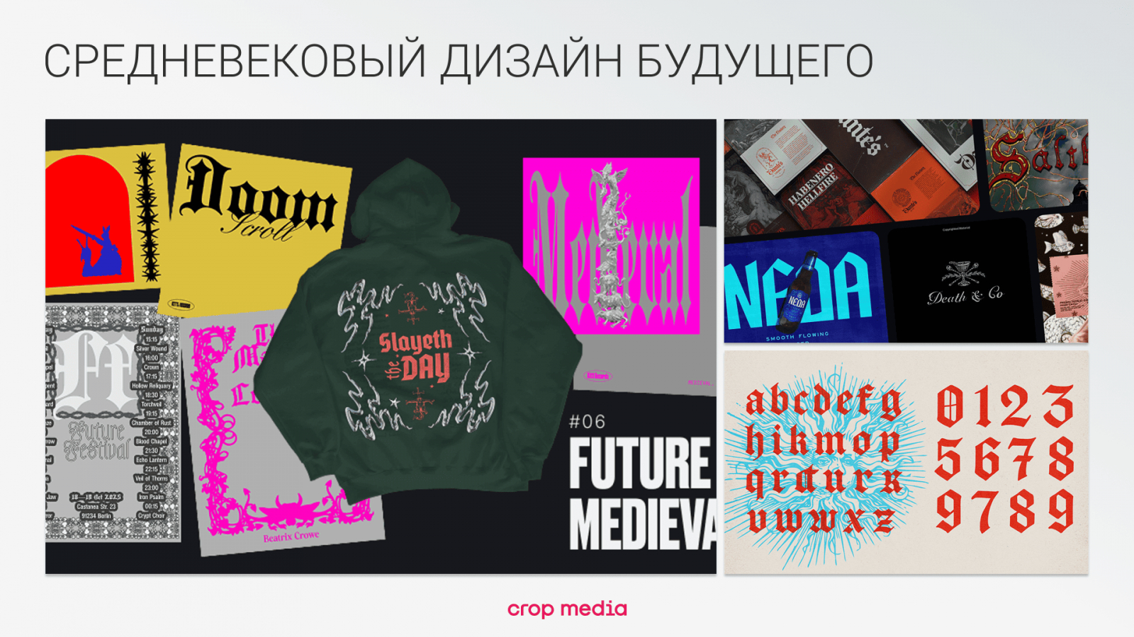 Готические шрифты + неоновые градиенты. Геральдика + глитч. Столкновение эпох, которое невозможно не заметить.