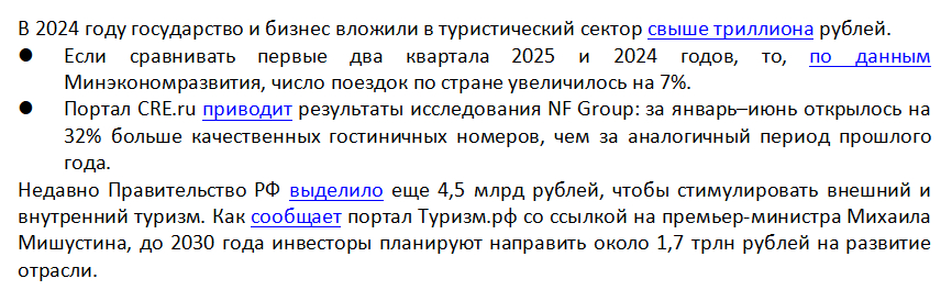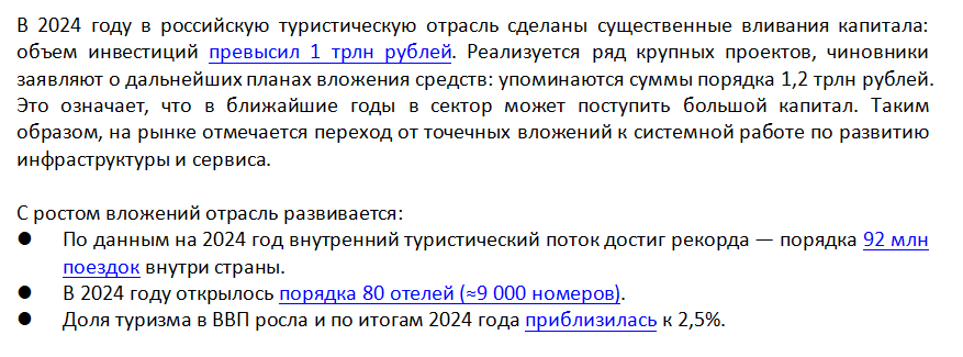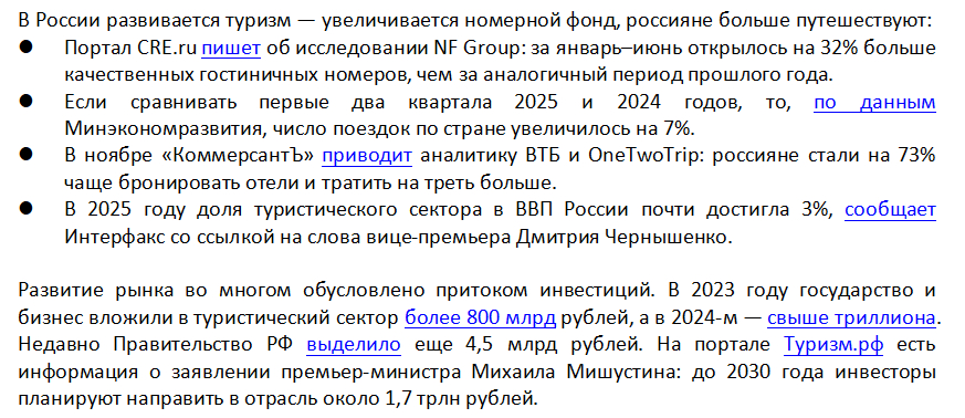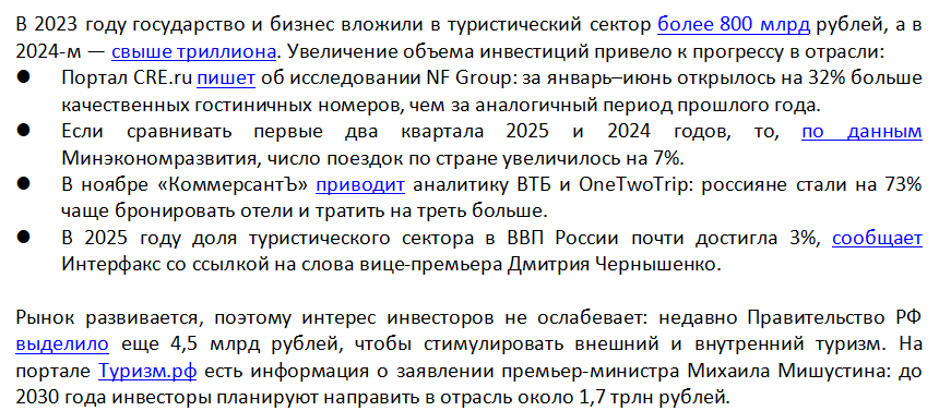 Представим ситуацию: в ноябре 2025 года нужно оперативно подготовить обзор инвестиций в российский туризм за 2025 год. Если попросить ChatGPT написать этот материал, получится примерно такой текст: