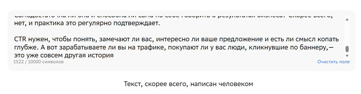 Проверка в сервисе-детекторе, разработанном крупной российской компанией, показала, что текст написан человеком. Ну, мы это и так знали.