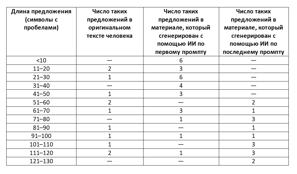 Видно, что человек употреблял равномерно длинные и короткие предложения, а ИИ — преимущественно фразы менее тридцати, двадцати и даже десяти символов. Это согласуется с данными литературы [1].