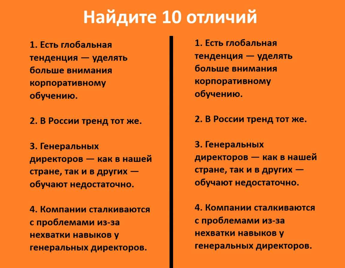 Между тем, обучение КЛИЕНТ: “Мне не нравится слово “топ-менеджеры”. топ-менеджерам необходимо. КЛИЕНТ: “Добавьте данные McKinsey, PwC или Deloitte”. Китайское исследование результатов компаний, чьи акции торговались на бирже с 2008-го по 2015-й, показало, что из-за недостатка тех или иных компетенций у генерального директора организация может столкнуться с проблемами плохих операционных показателей и низкой рентабельности активов. КЛИЕНТ: “В этой фразе не хватает цифр. Какой процент генеральных директоров столкнулся с проблемой низкой рентабельности активов? Добавьте конкретику: какие именно плохие операционные показатели?”».
