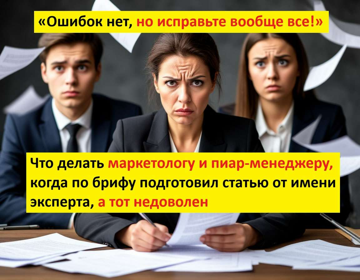 У маркетолога и пиар-менеджера в таких случаях закономерно возникают вопросы. Почему эксперт утвердил план материала? Зачем на интервью рассказывал об одном, если в тексте хочет видеть совсем другое? Почему замечания для правок не мог сформулировать внятно с первого раза?