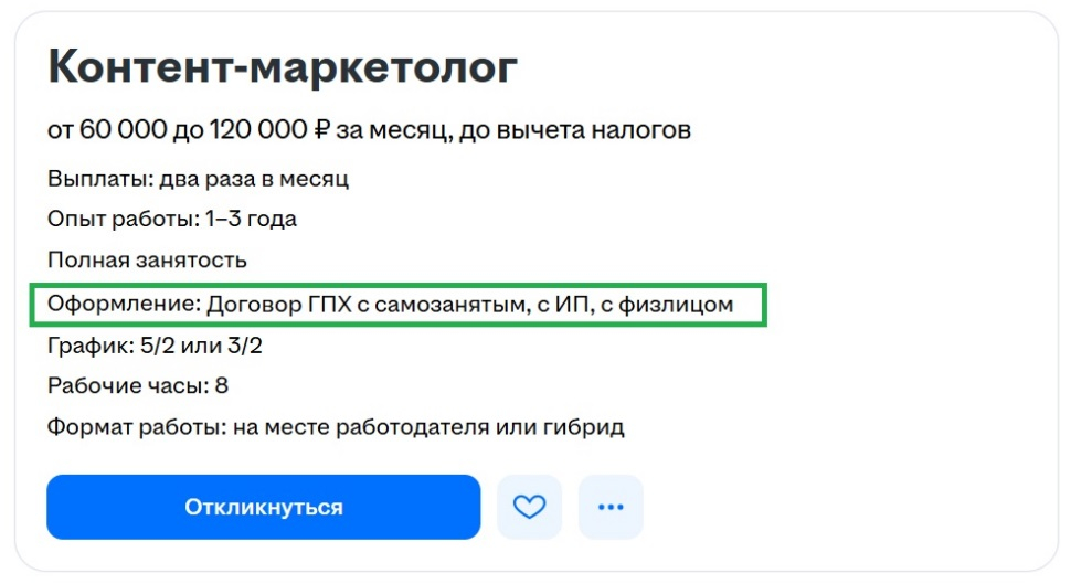 Мы исследовали вакансии маркетологов и пиар-менеджеров (от ассистента до директора), где предлагают оформление по самозанятости или договор с ИП. Из 140 случаев, когда указана сумма и предусмотрена полная занятость, в 72,9% бюджет на услуги исполнителя меньше, чем бюджет работодателя, когда сотрудники по ТК РФ получают среднюю зарплату по стране.