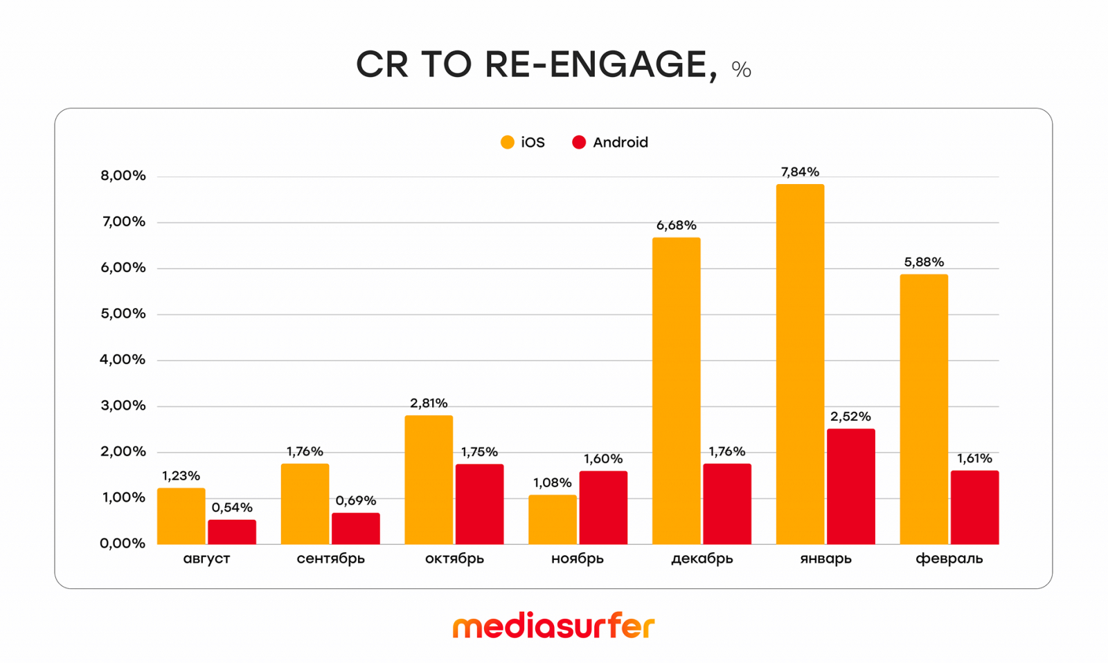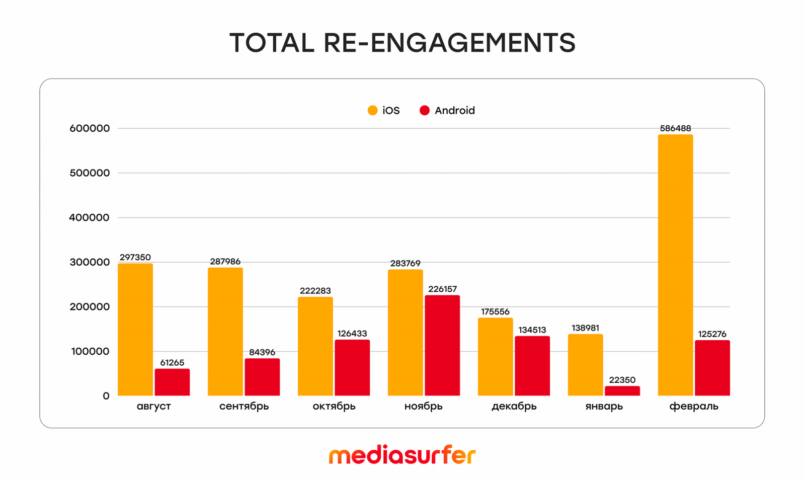 iOS: После первоначального отставания благодаря проведённым оптимизациям показатели значительно улучшились. Возвращенные пользователи совершили 37 899 покупок, среднее выполнение плана за период составило 130%.