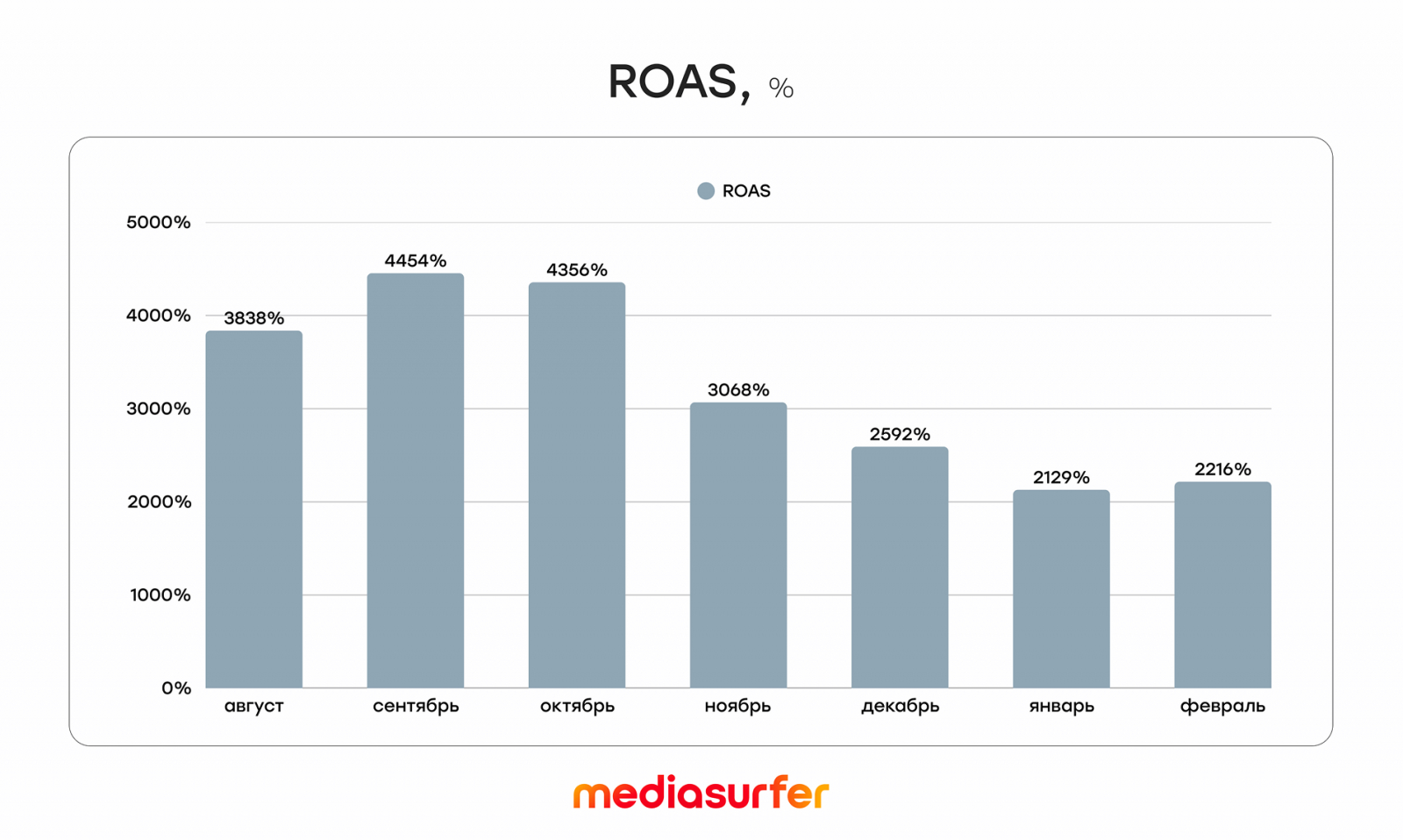Например, в ноябре (Черная пятница) показатель ROAS составил 3 068%, а в декабре (новогодние продажи) — 2 592%. Это подтверждает устойчивость выбранной стратегии в условиях повышенного спроса и высокой конкуренции.