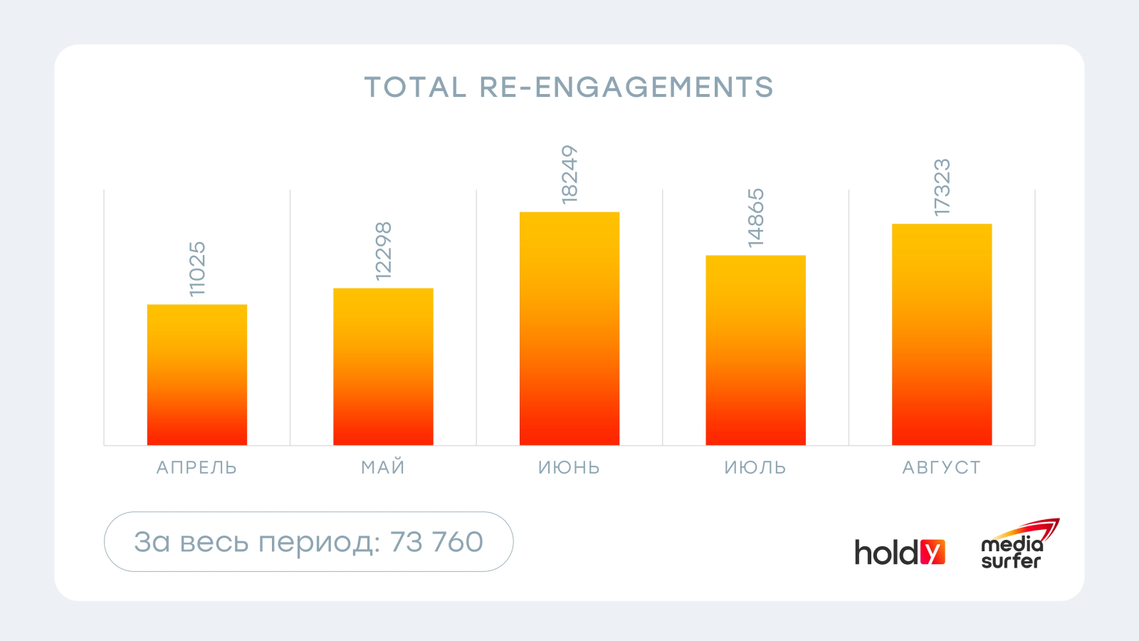 Для возврата пользователей в приложение мы использовали собственную платформу Holdy.app. Это позволило снизить стоимость целевого действия: не было комиссии за использование сторонних сервисов, а алгоритмы платформы автоматически оптимизировали ставки.