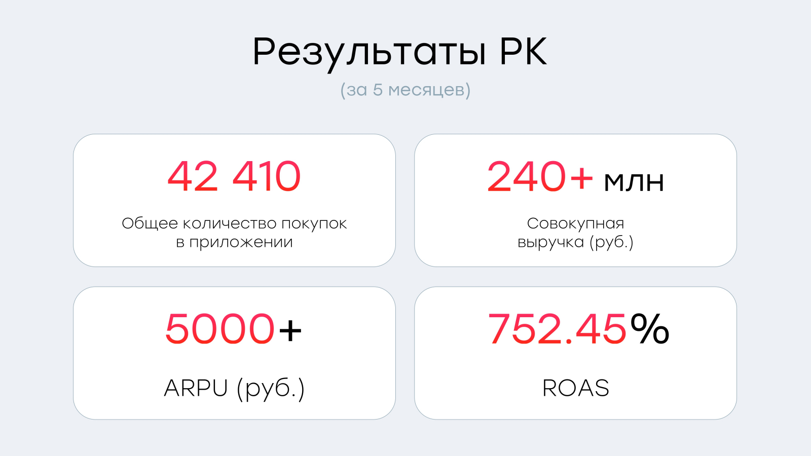 За счёт комплексного подхода, даже в условиях высокой конкуренции и роста стоимости трафика в летний сезон, нам удалось удержать CPA на целевом уровне, обеспечить рост установок и увеличить количество покупок в приложении.