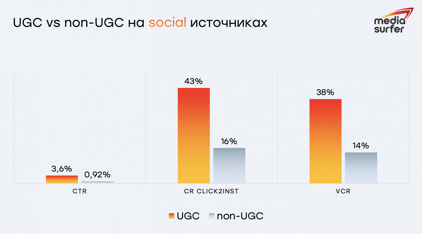 На графике можно увидеть сравнение результатов по UGC и non-UGC-креативам: первые показывают в разы лучшие показатели по CTR, конверсии из клика в инстал и VCR. По каждому из этих параметров UGC-креативы в 3 раза превосходят non-UGC-креативы.