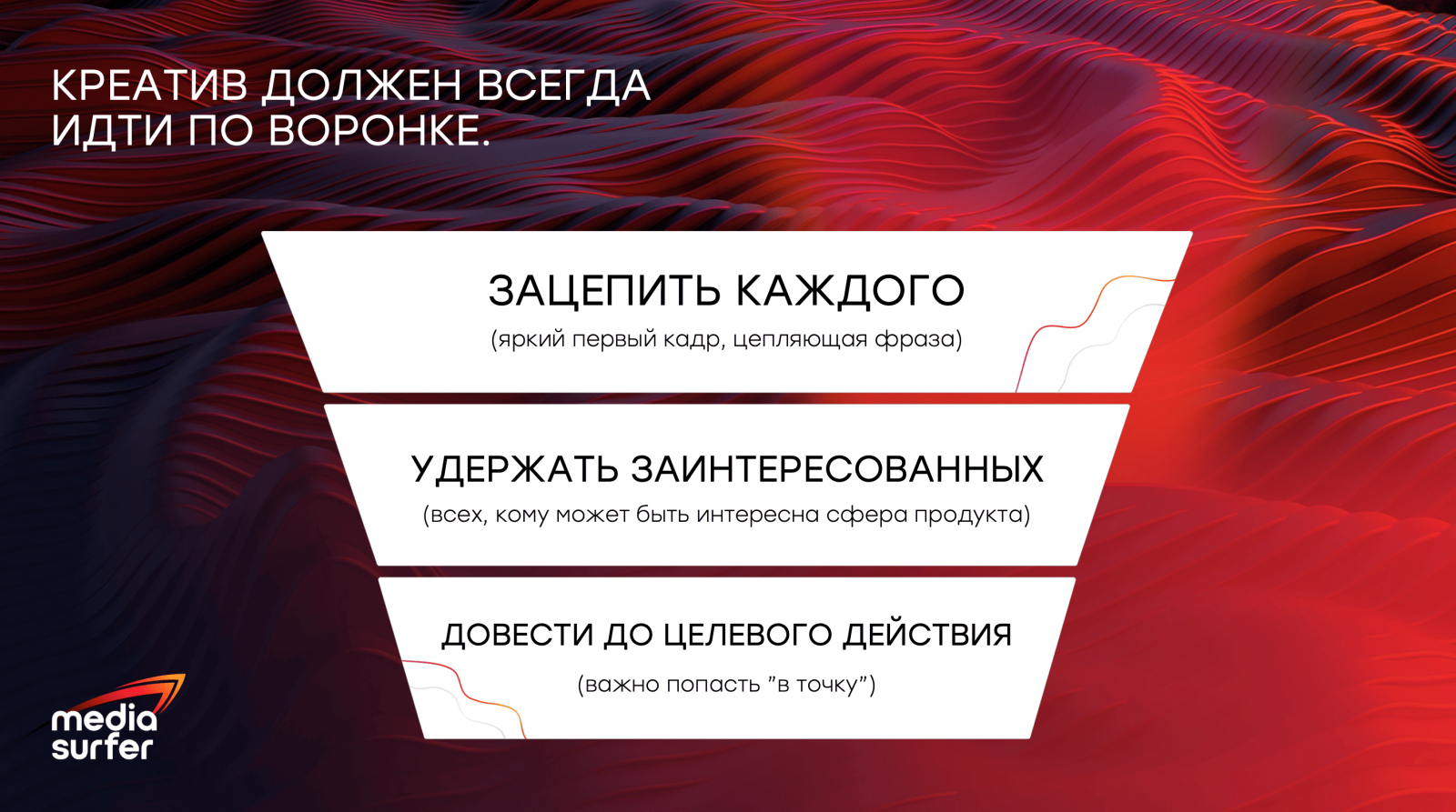 Однако именно креатив должен быть в первых рядах, потому что только он способен дать максимальный прирост эффективности. В performance-маркетинге мы боремся не только за внимание пользователя, но и за контекст, в котором он воспринимает продукт.
