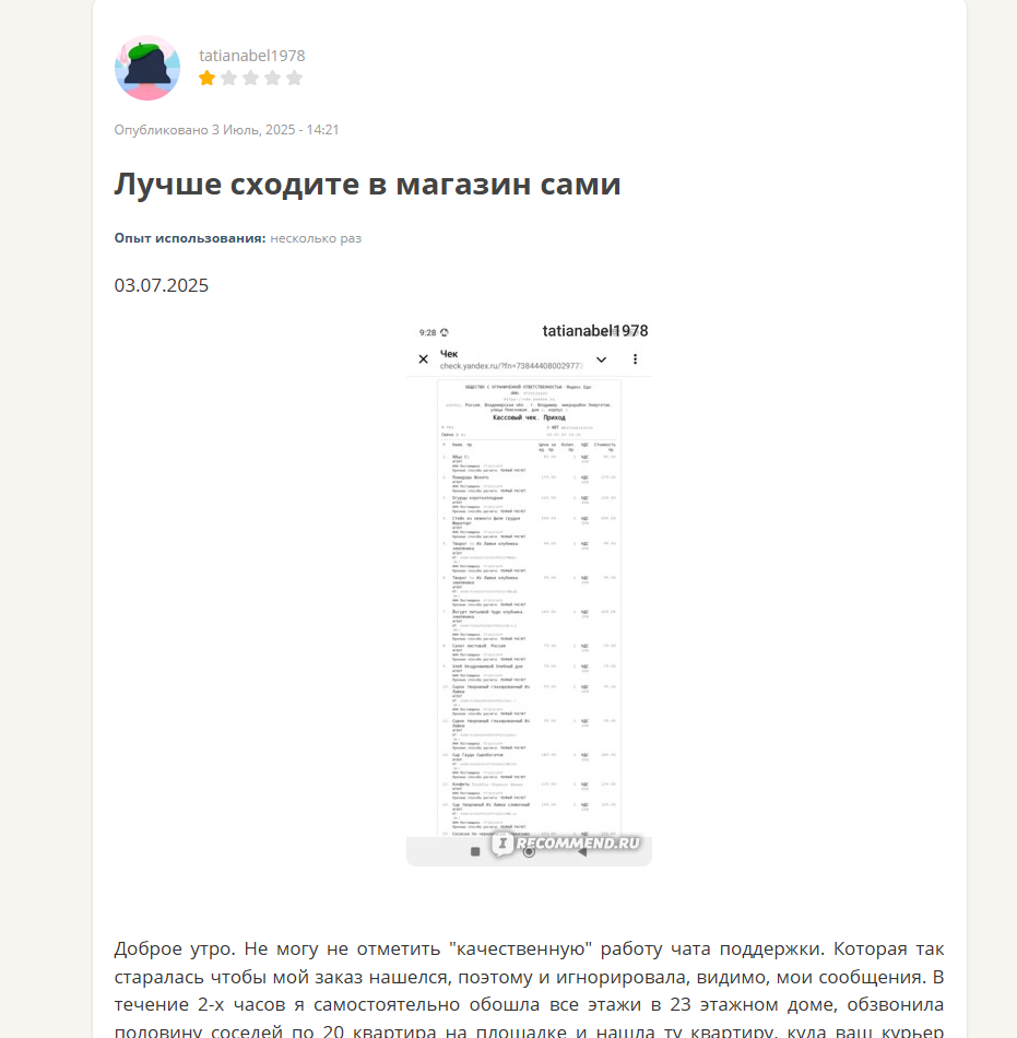 Свежий отзыв от июля 2025 года на irecommend.ru уверенно заявляет: «лучше сходите в магазин сами». Женщина рассказывает детективную историю: заказ пропал, поддержка молчала, курьер перепутал этажи (3-й превратился в 13-й), а часть продуктов успели съесть соседи. Три часа поисков по подъезду, звонки, нервы, бесконечный чат… Ну и итог: «рекомендовать никому не буду».
