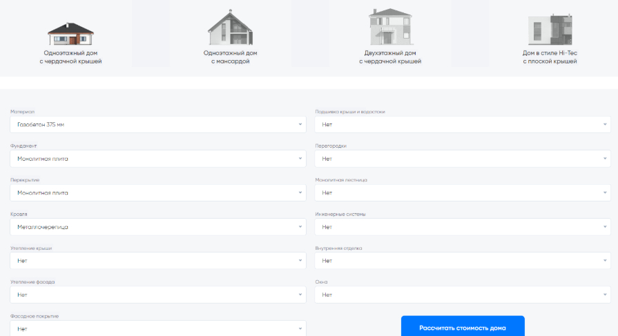 Наши заказчики хотели предложить клиентам удобный инструмент, который бы позволял рассчитать стоимость дома в зависимости от множества факторов: типа дома, материала, фундамента, перекрытий и других параметров. Это должно было быть простое, но эффективное решение для клиентов, которые не хотят тратить время на сложные расчеты, но хотят получить точную цену.