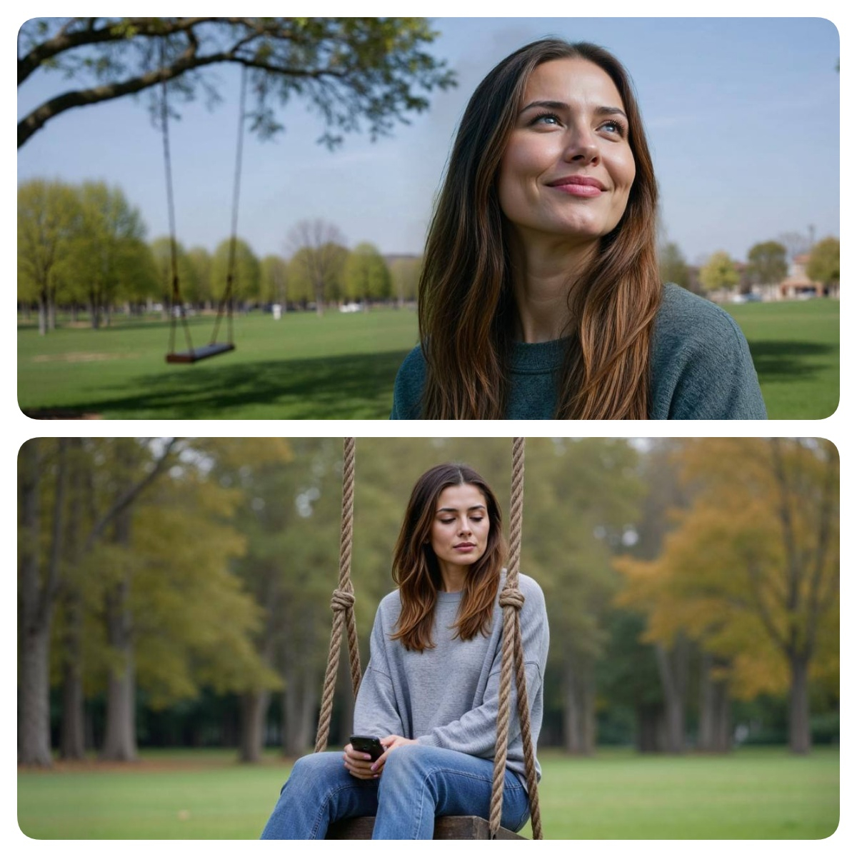 Мы решили сосредоточиться на деталях. Перепробовали десятки описаний, уточняя все: от формы сиденья до фона. Нейросеть выдала сотни вариантов, и каждый мы проверяли, насколько качели похожи. Это был долгий процесс, но в итоге тщательная настройка промптов сработала. Оба кадра — один с девушкой на качелях, другой с ней же перед качелями — теперь выглядят связно и правдоподобно.