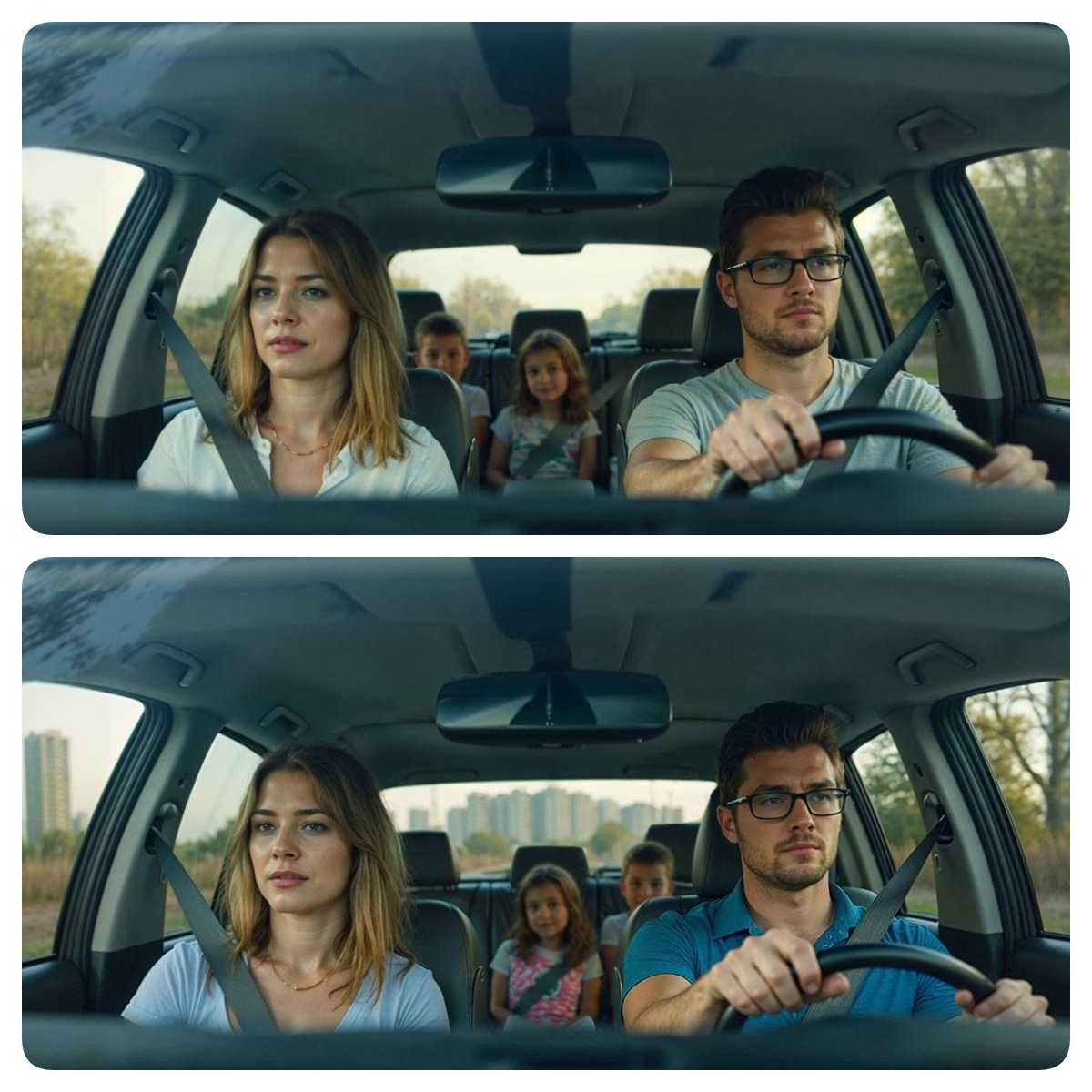 Для сцены в автомобиле мы сэкономили время и сохранили однородность локации, работая с единственным «базовым» кадром. Сначала сгенерировали идеальный ракурс внутри машины — правильный свет, четкие лица героев и детализированный салон.