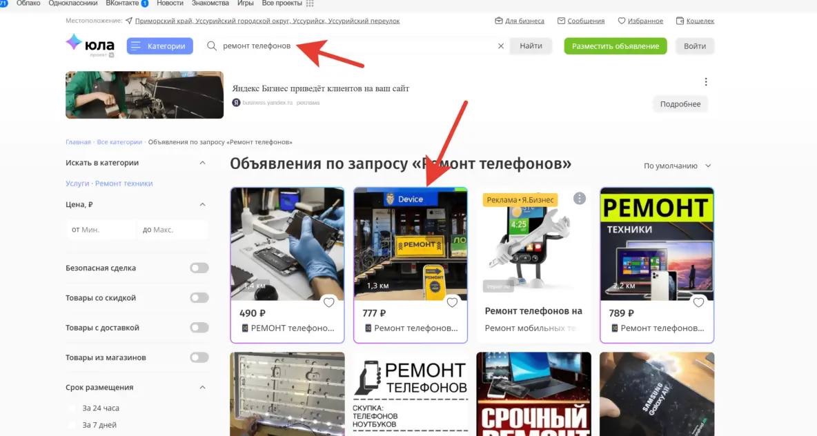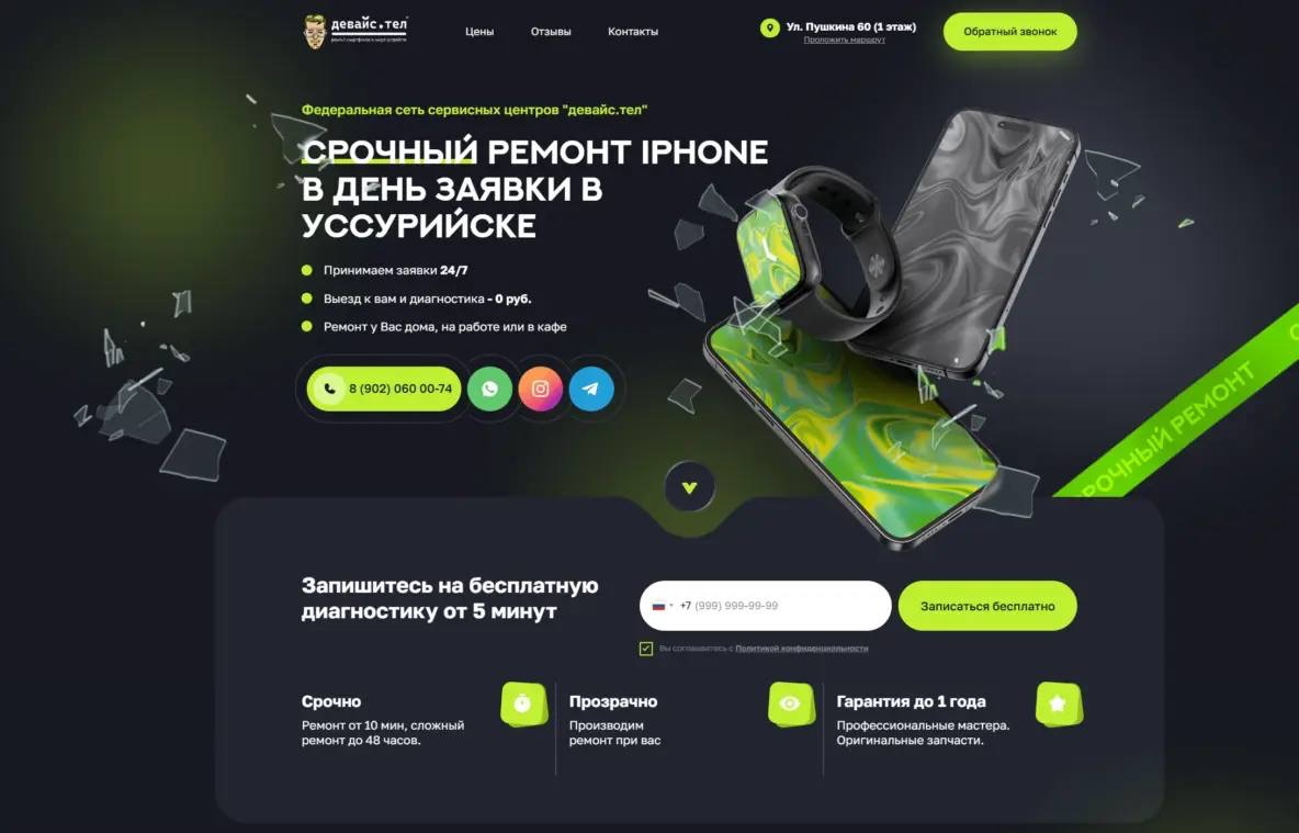 - Оффер на первом экране; “Срочный ремонт телефонов в день заявки в Уссурийске”.