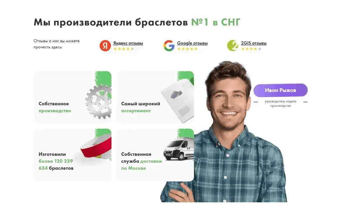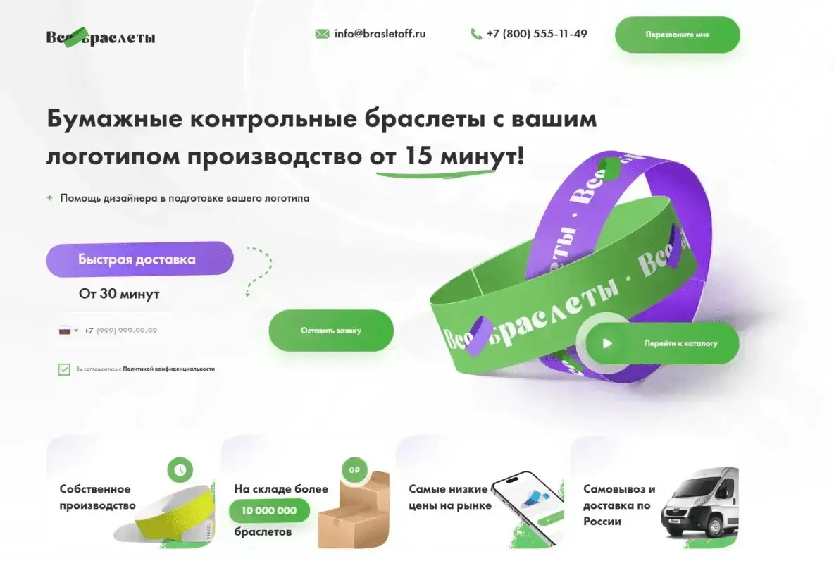 - Оффер на первом экране: "Браслеты с вашим логотипом. Производство от 15 минут!"