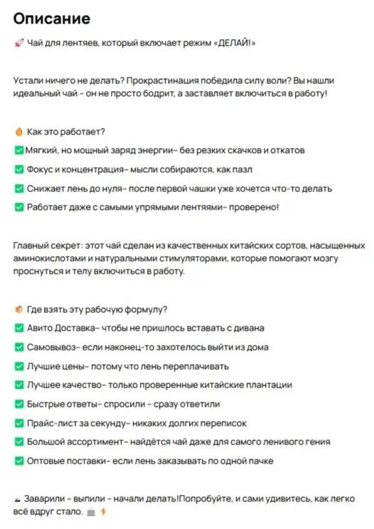 - Добавили описание с конкретикой: доставка, гарантии, первые сорта