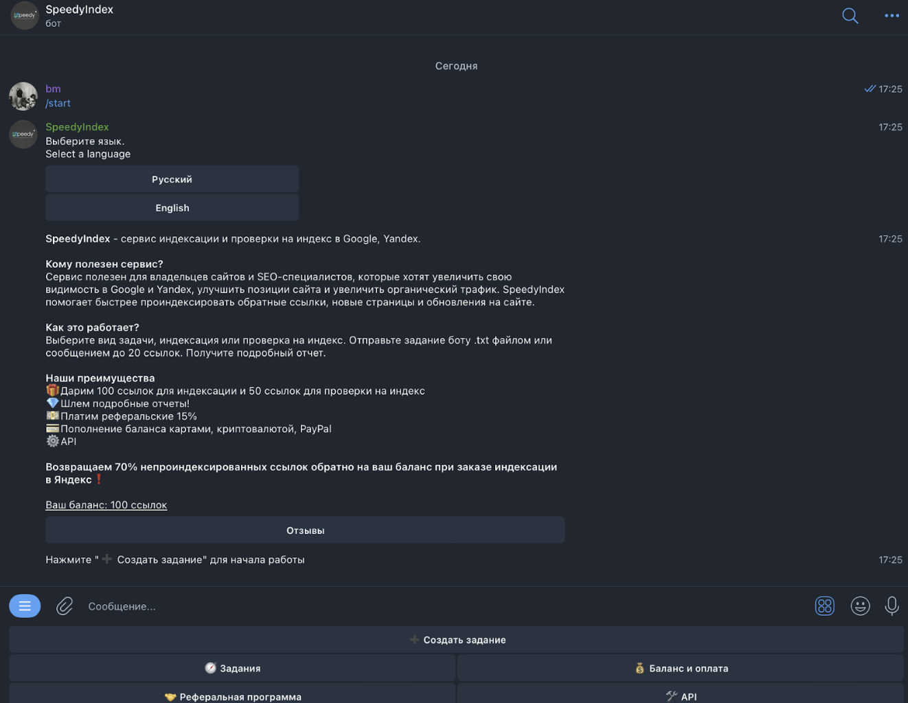 SpeedyIndex дарит 200 ссылок для теста — чтобы вы сами убедились в эффективности. Просто откройте SpeedyIndexBot в Telegram, загрузите файл и проверьте результат через 72 часа.