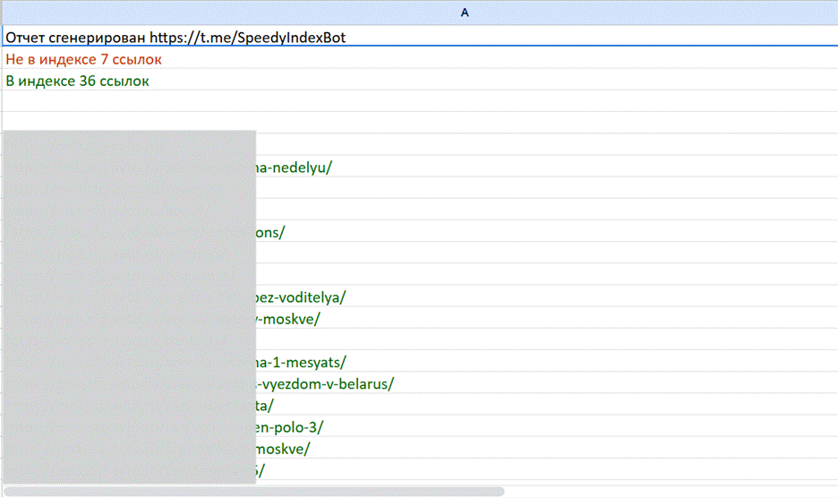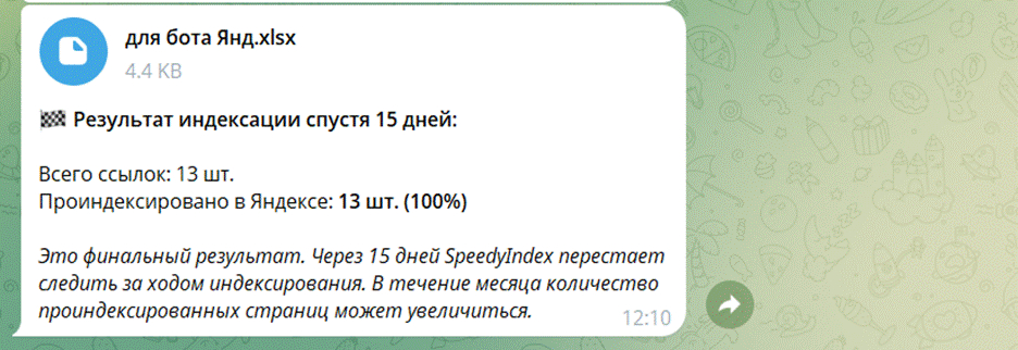 На 15 день после отправки задания вы получите подробный отчет с результатами индексации.