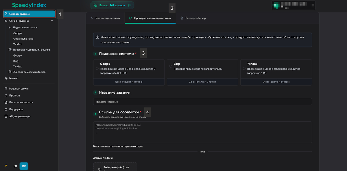 Чтобы запустить проверку индексации сайта в Яндексе, достаточно создать задачу в Telegram-боте SpeedyIndex или веб-версию, загрузить список URL и дождаться отчета.