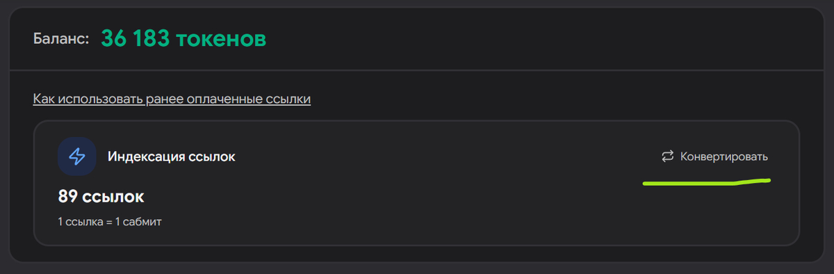 Если у вас есть баланс ссылок в боте, вы можете конвертировать его в токены: