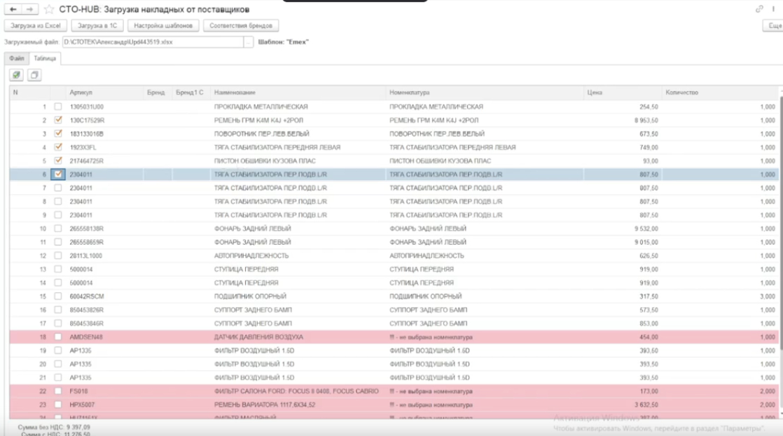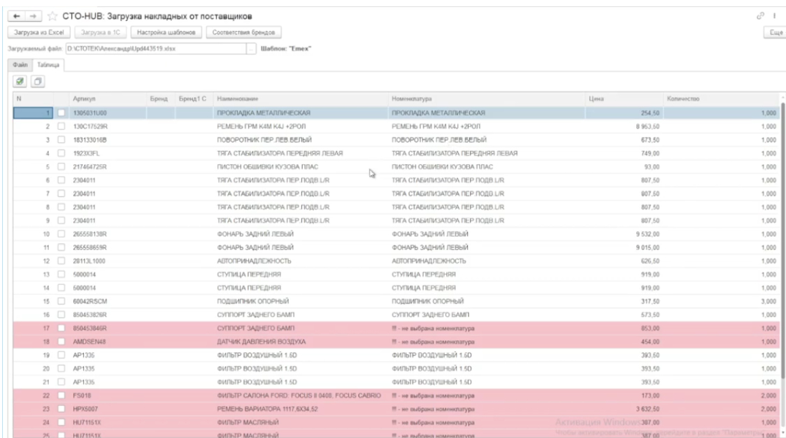 После загрузки содержимое файла отображается во вкладке. В таблице вы видите товары и соответствующие им номенклатуры из вашей базы данных. Соответствие определяется по артикулу и бренду, что позволяет избежать ошибок.