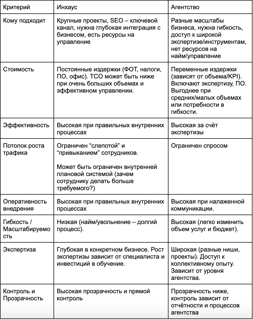 Если у вас крупный сайт, где тысячи страниц, сильная конкуренция и поиск – основополагающий источник трафика, который невозможно заменить рекламой и другими каналами. Тогда да, вам однозначно имеет смысл создавать инхаус отдел, но будет ли это дешевле агентства? Нет не будет. Одного спеца вам не хватит, а двое уже дороже, чем агентство.