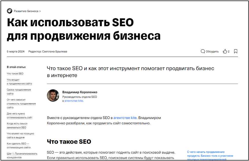 А вот пример с вершин ТОПа. Да, нам не пишут время прочтения, но говорят, кто автор, кто редактор, когда опубликован материал (иногда можно встретить и дату обновления, что тоже важно!). Мы сразу знаем, что читаем статью руководителя отдела SEO — эксперта в теме статьи.