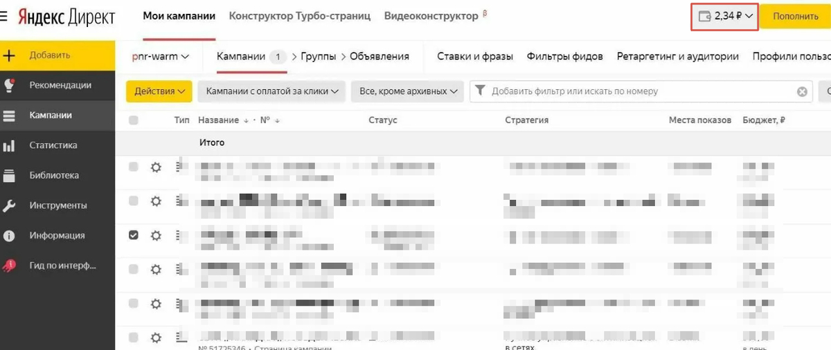 Самая банальная, но частая причина — закончились деньги. Даже если вы уверены, что пополняли бюджет недавно, стоит зайти в Яндекс Директ и убедиться, что на счету есть средства. Учтите, что списание происходит не мгновенно, и при нулевом балансе кампания может приостанавливаться без предупреждения.