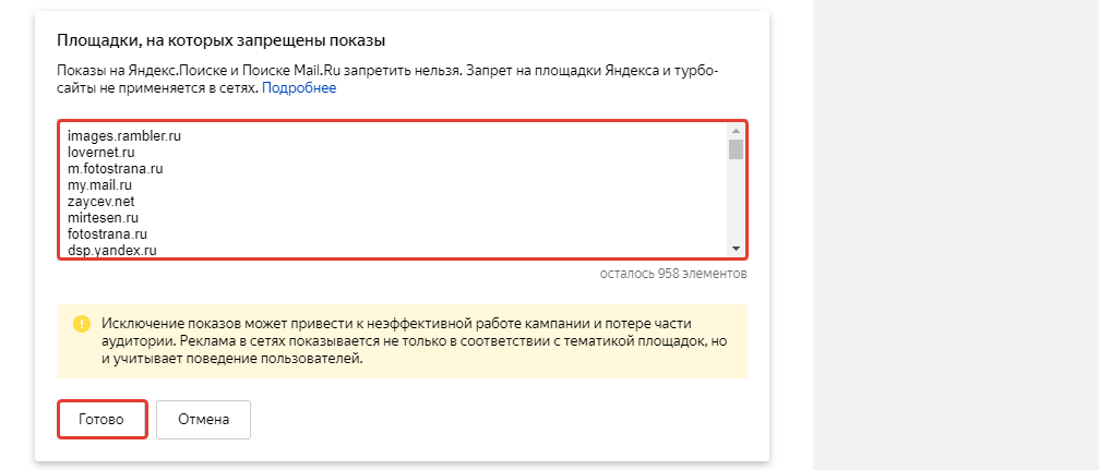 Иногда в кампании указаны запрещенные площадки — сайты, на которых реклама не будет показываться. Это делается, чтобы исключить нецелевой трафик, но со временем список может разрастись настолько, что ограничит охват почти полностью. Особенно часто это случается в РСЯ, где количество площадок велико.
