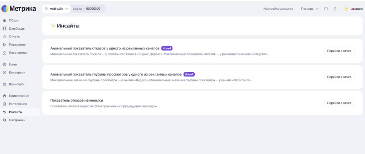 С 18 июня в Метрике работает функция «Инсайты». Она автоматически уведомляет о значимых изменениях в ключевых показателях: падение конверсий, всплески трафика, изменения в источниках. Это позволяет реагировать на проблемы и возможности быстрее, чем раньше.