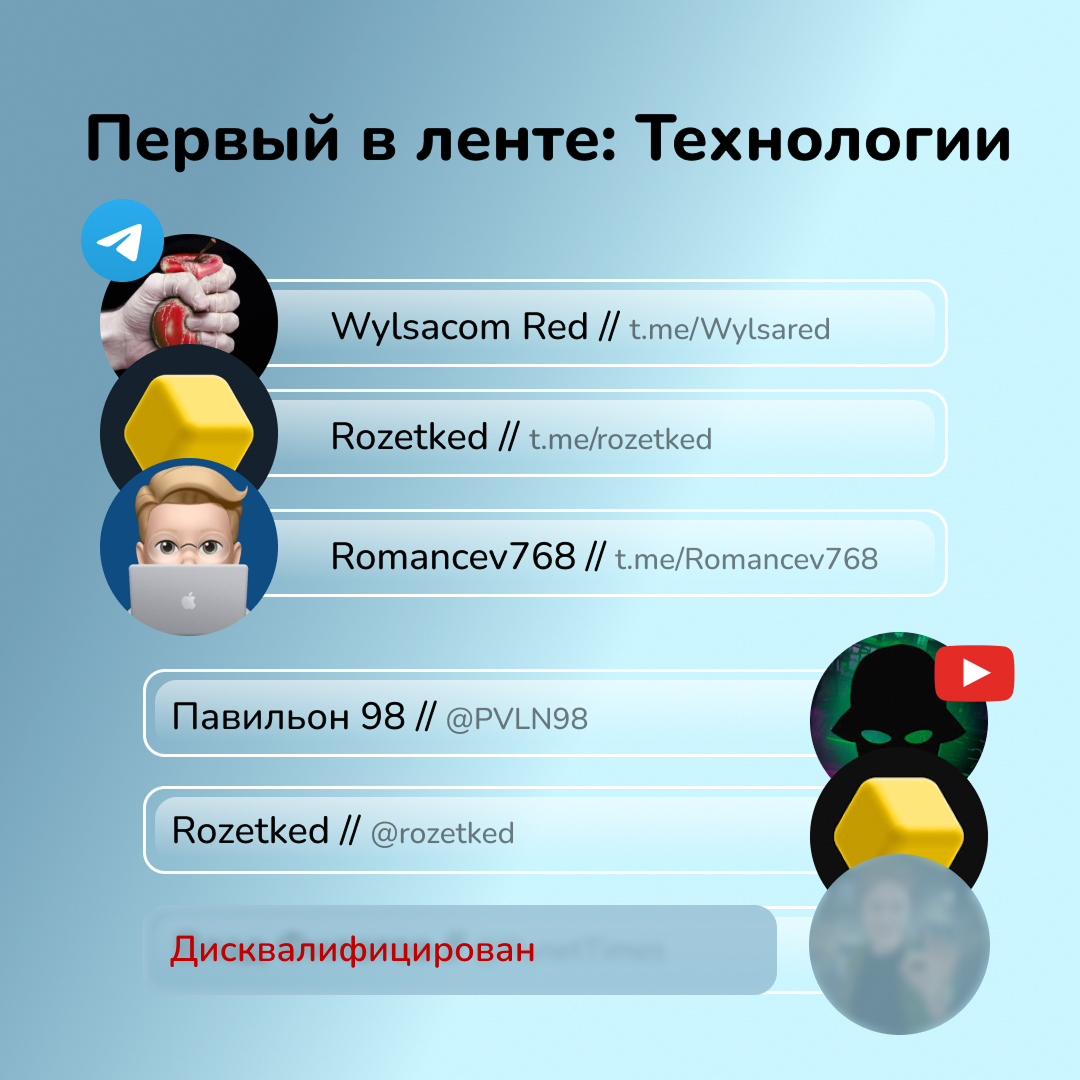 К Международному дню блогера 14 июня TGStat Agency и Polyana представили немонетарный рейтинг «Первый в ленте». В него вошли блогеры Telegram и YouTube, которые растут быстрее других, удерживают внимание аудитории, активно вовлекают ее и получают высокие просмотры.