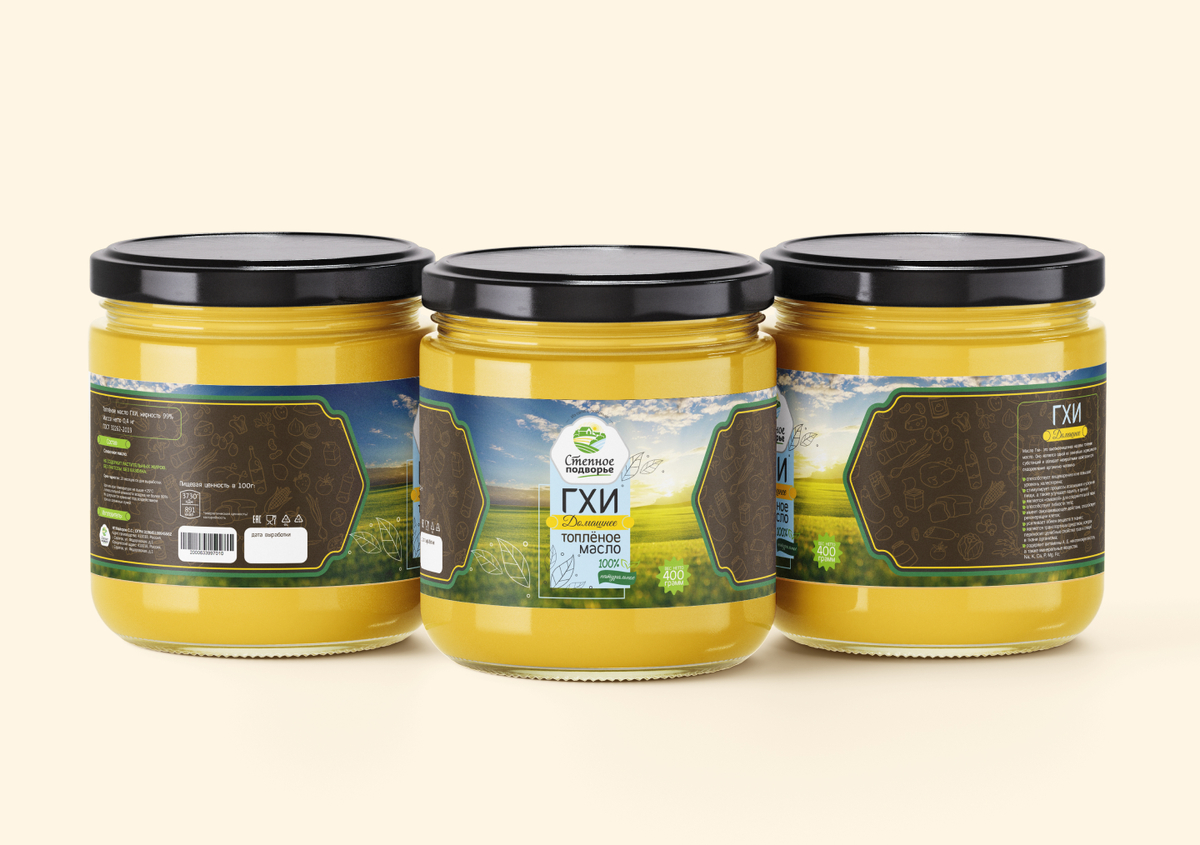 3. Упаковка топлёного масла для Степного подворья. Дизайн вдохновлён идеей качества и натуральности продукта. Визуальный образ отражает заботу о природе и высокие стандарты, которые применяются на каждом этапе производства. Цветовая палитра дизайна — светлые, яркие и сочные оттенки, передающие ощущение природной свежести и натуральности. Они вызывают ассоциации с чистотой и натуральностью, создавая положительное первое впечатление о продукте.
