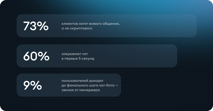 Но сегодня боты стали частью интерфейсного мусора. Большинство либо закрывает иконку чата на автомате, либо не замечает вовсе, либо пробует начать диалог и в первые 10 секунд понимает: это бессмысленно. Пользователь уже знает, чем всё закончится: скрипт, кнопки, «оставьте номер — вам перезвонят». Всем нам знакомо.