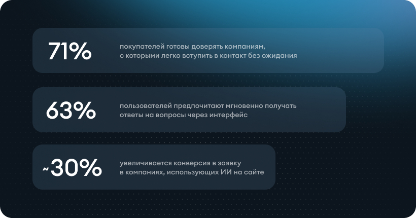 По данным Data Insight (исследование 2023 года), 63% пользователей в России предпочитают решать вопросы с бизнесом через интерфейс, который дает мгновенный ответ – будь то онлайн-чат, ИИ-бот или голосовой помощник. Еще важнее: 71% покупателей готовы доверять компаниям, с которыми легко вступить в контакт без ожидания.