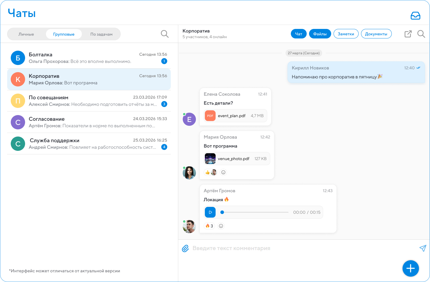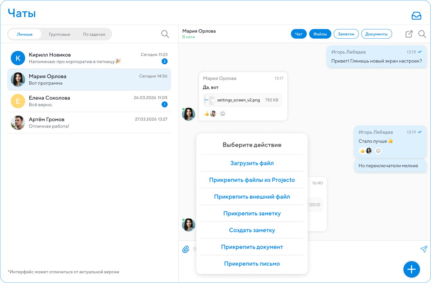 Все переписки объединены в единый список и автоматически сортируются по последней активности. Есть индикаторы непрочитанных сообщений и удобный поиск по чатам. Из любого диалога можно мгновенно перейти к задаче, проекту или событию, к которому он относится. Это экономит время и избавляет от путаницы: не нужно искать обсуждение в одном месте, а дедлайны — в другом.
