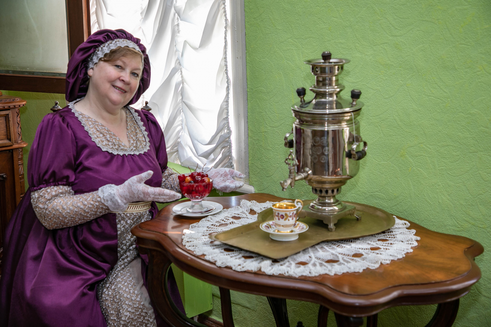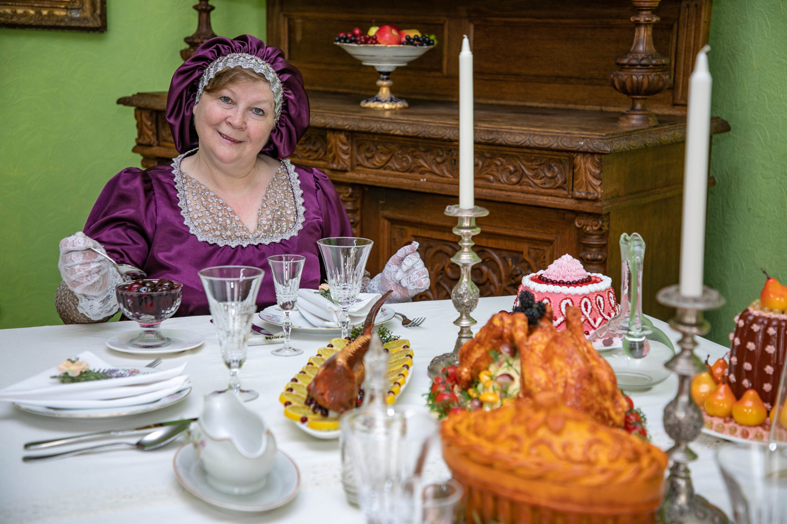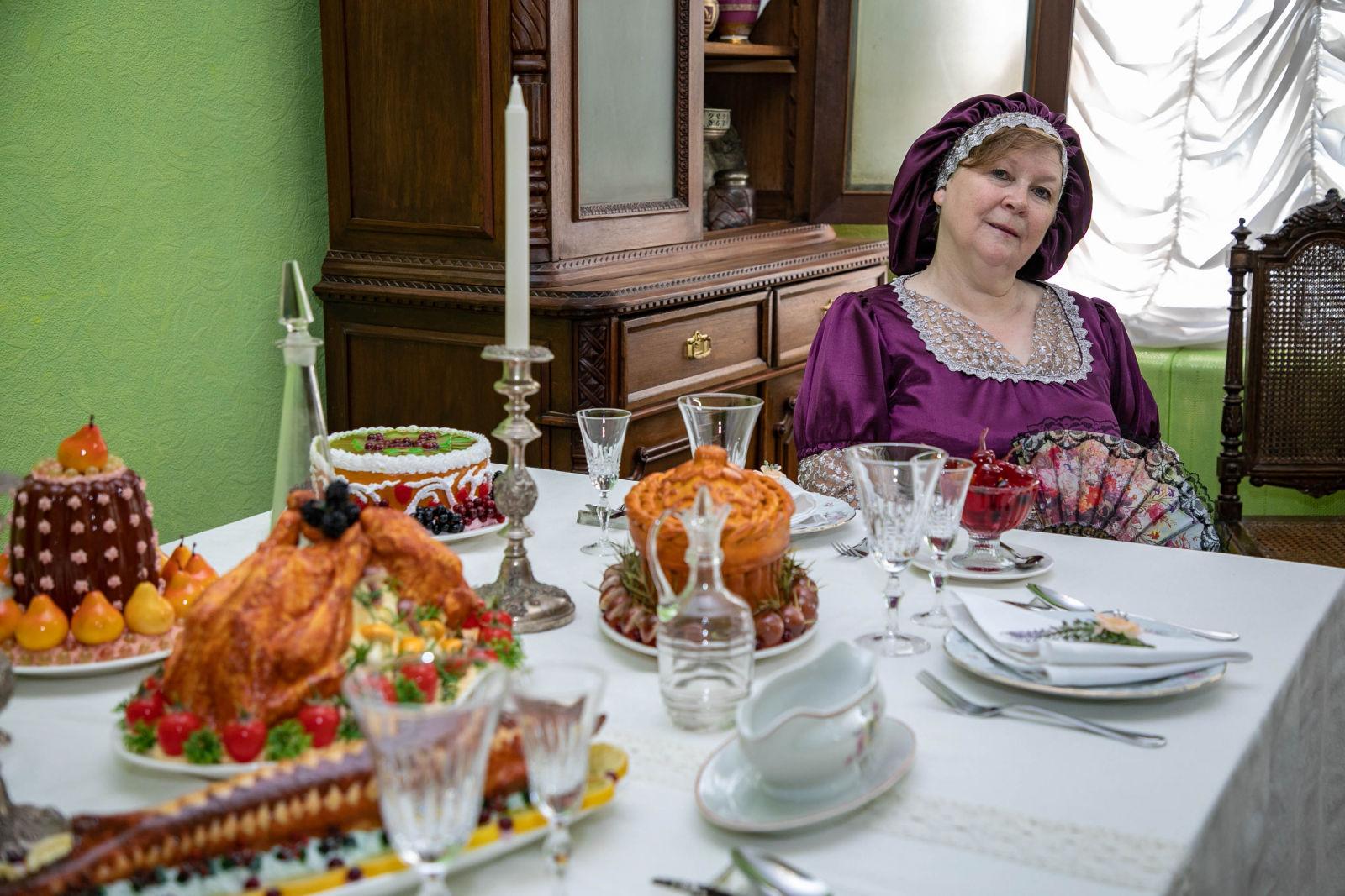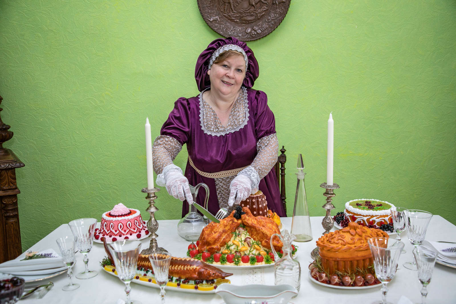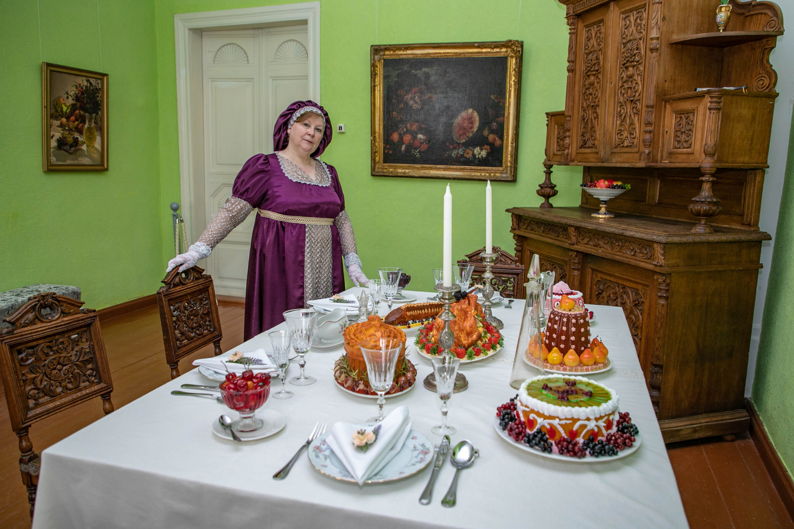 В обновленном интерьере экспозиции стол с белоснежной скатертью накрыт праздничными блюдами, пирогами и десертами. Сервировка стола воссоздана с использованием столовой посуды в стиле «ретро» и подлинных предметов XVIII - XIX в.в. из фондов музея.