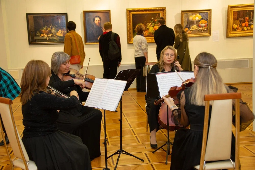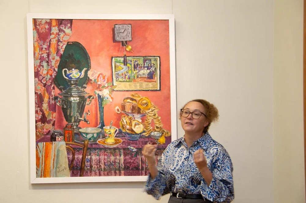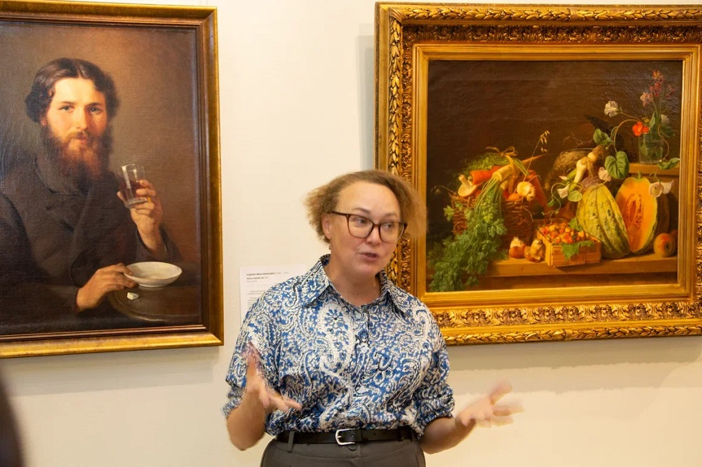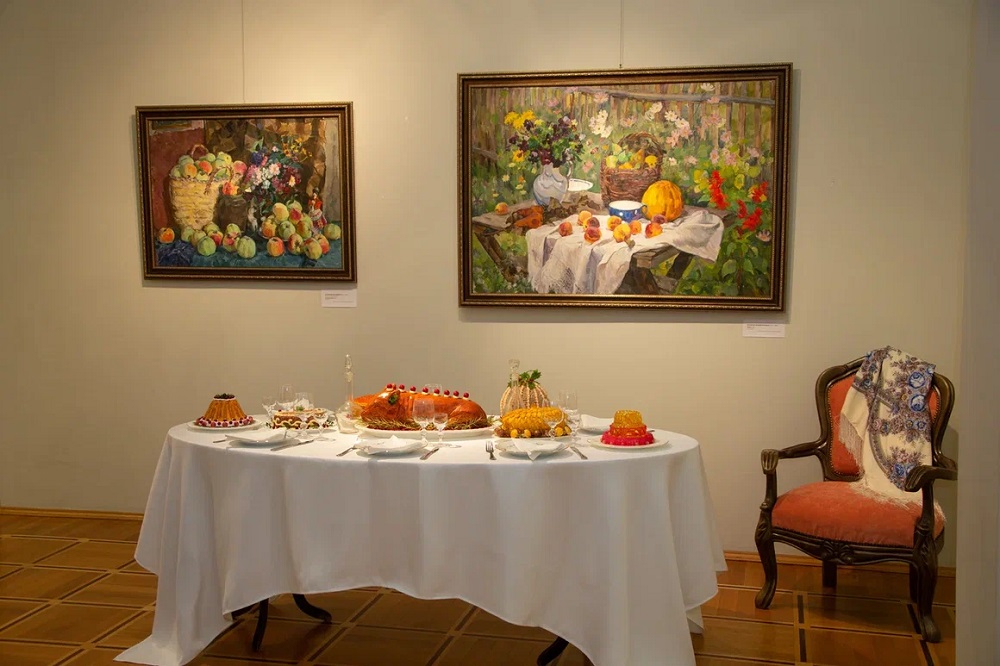 Мы очень надеемся , что вы посмотрите не только произведения Русского музея, но и пройдете в другую часть зала, где представлены картины Республиканского музея изобразительных искусств. Это совершенно прекрасные натюрморты, которые дополняют коллекцию Русского музея и позволяют зрителю плавно перейти из XIX, XX веков в век XXI и посмотреть, как люди в наше время воспринимают натюрморт, еду, общий стол".