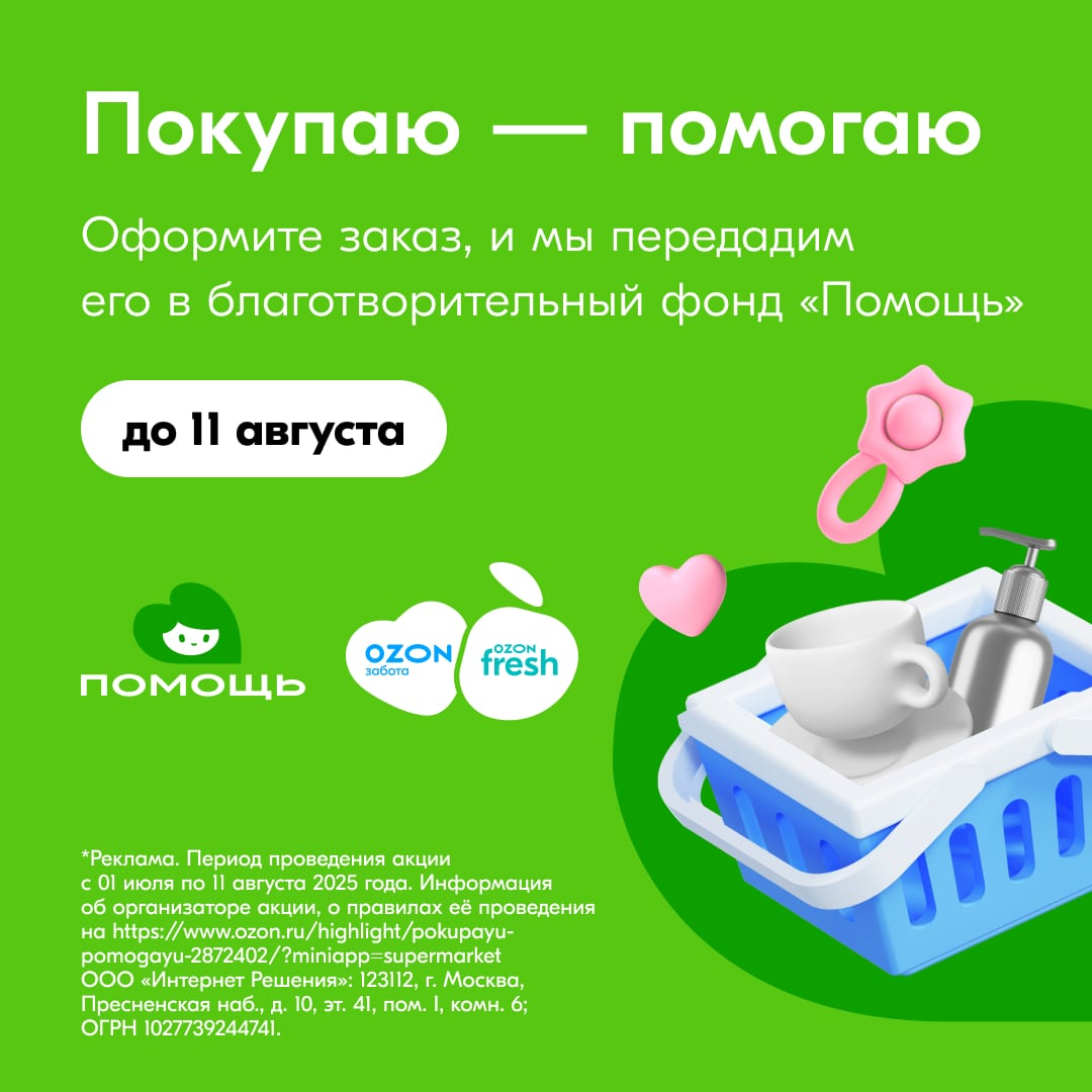 «Покупаю — Помогаю» — благотворительная инициатива Ozon Заботы, в рамках которой пользователи маркетплейса могут помочь подопечным фондов-участников, напрямую направив им товары Ozon fresh. Ранее такую возможность уже опробовали такие благотворительные организации как «Старость в радость», «Подари жизнь», «Ночлежка» и другие.